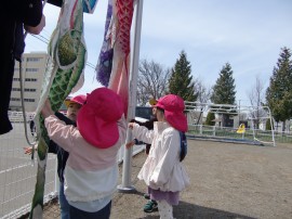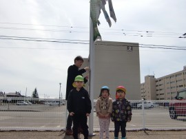 永山おおぞら認定こども園 こいのぼりあげ 2025年4月22日(火) たんぽぽ組・ゆり組・ひまわり組の子どもたちとこいのぼりをあげました🎏 3人のお友だちが代表であげてくれました🧡🎏🧡「重い~🎏」と言いながら、力を合わせて頑張ってくれました✨✨✨ こいのぼり🎏に触ってみました💕 もどる